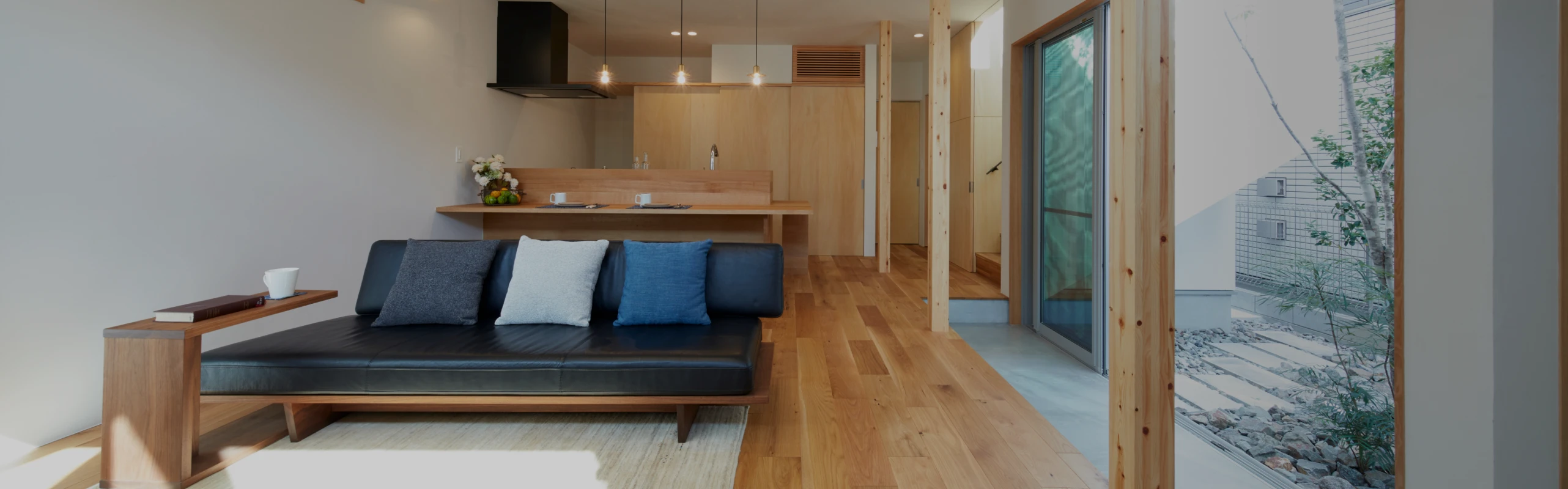 水回りの位置は大きく変えず、部屋と部屋の間仕切り壁を取り払うことで眺めの良い北東の方角に向けて広がるワンルームのLDKとしました。