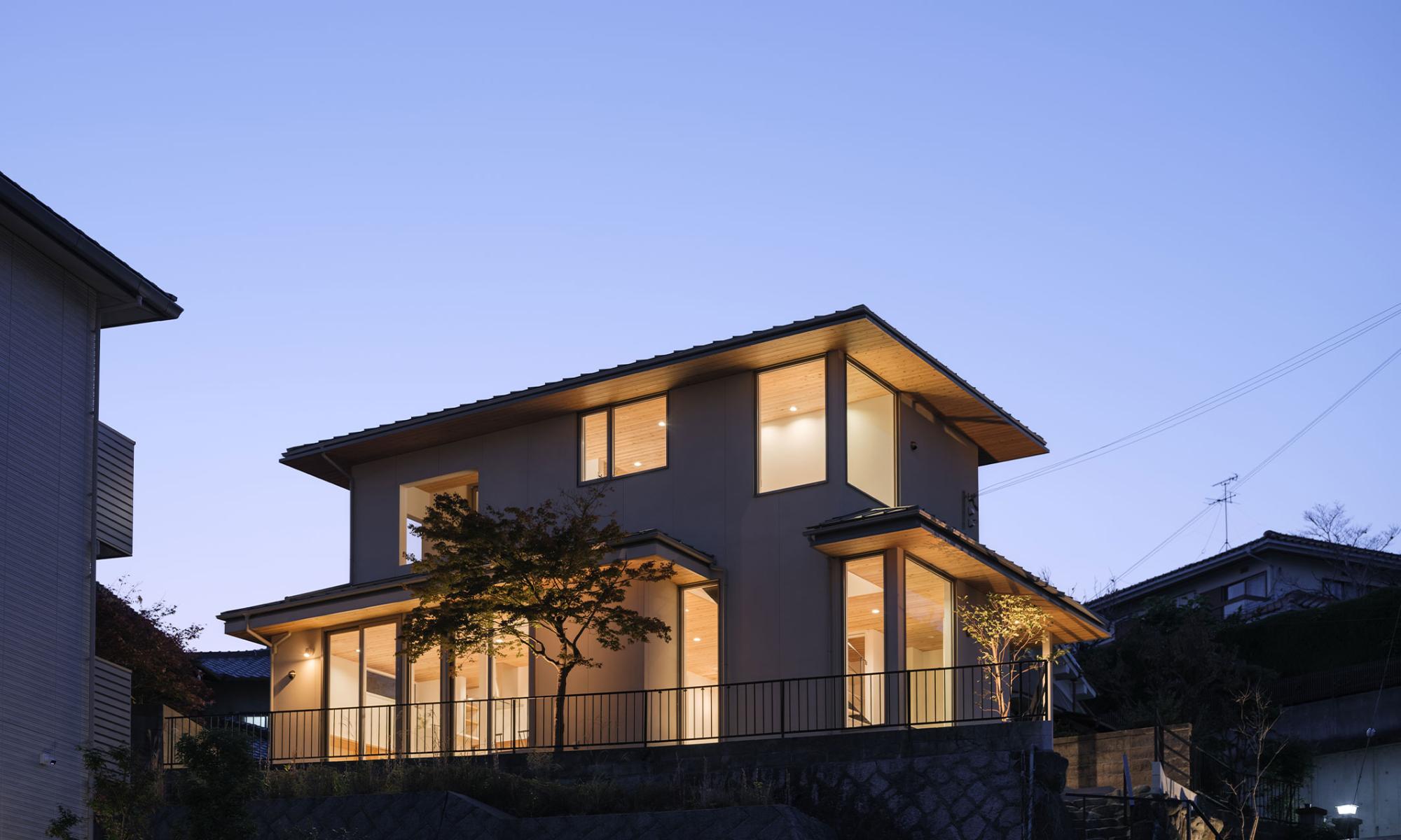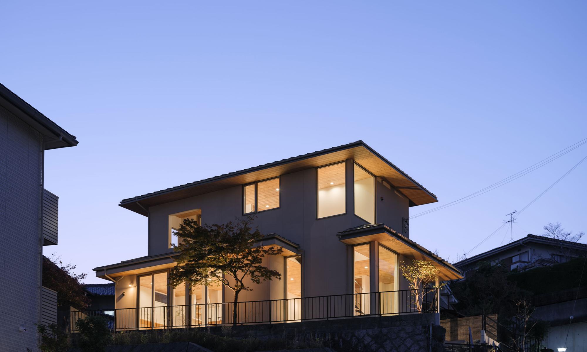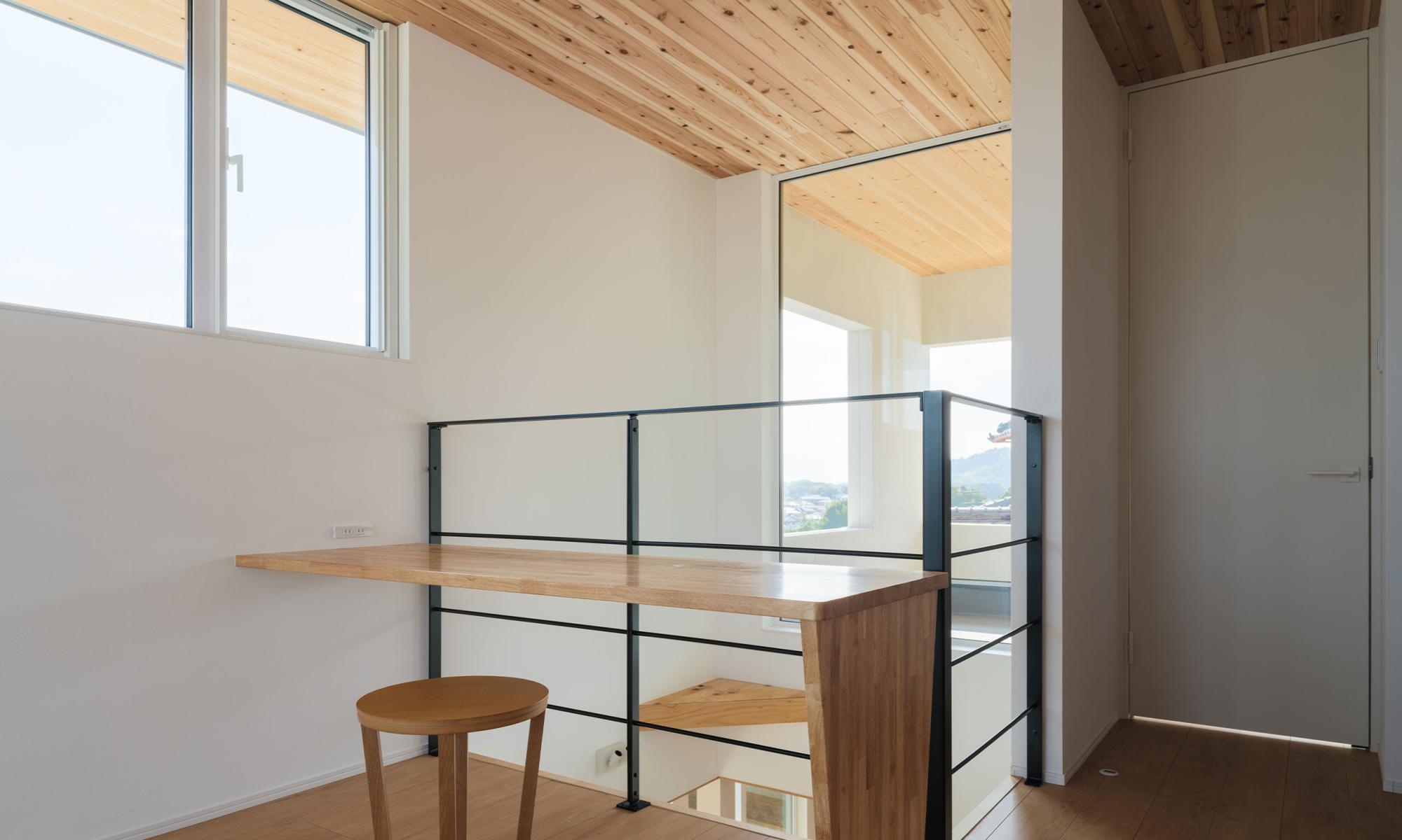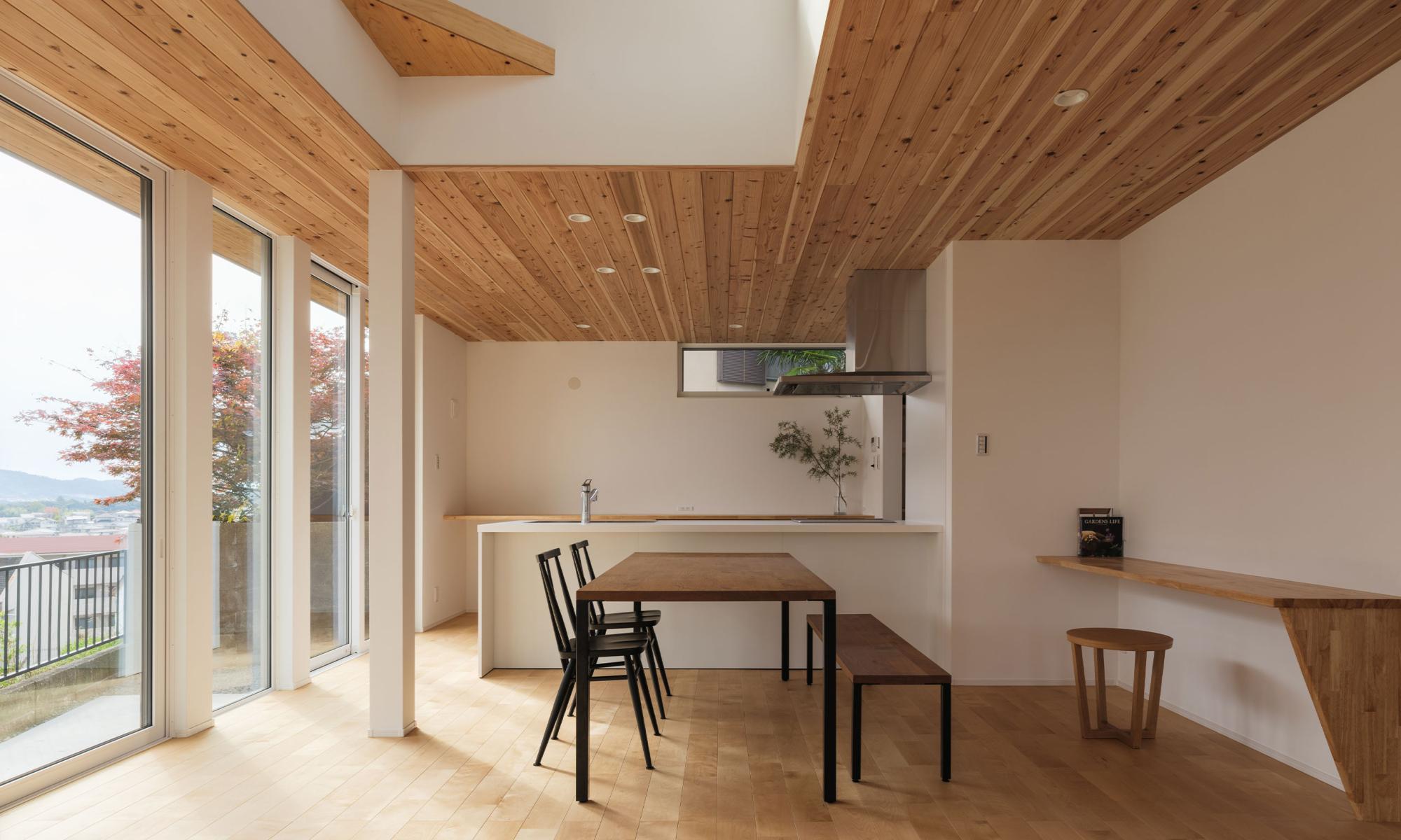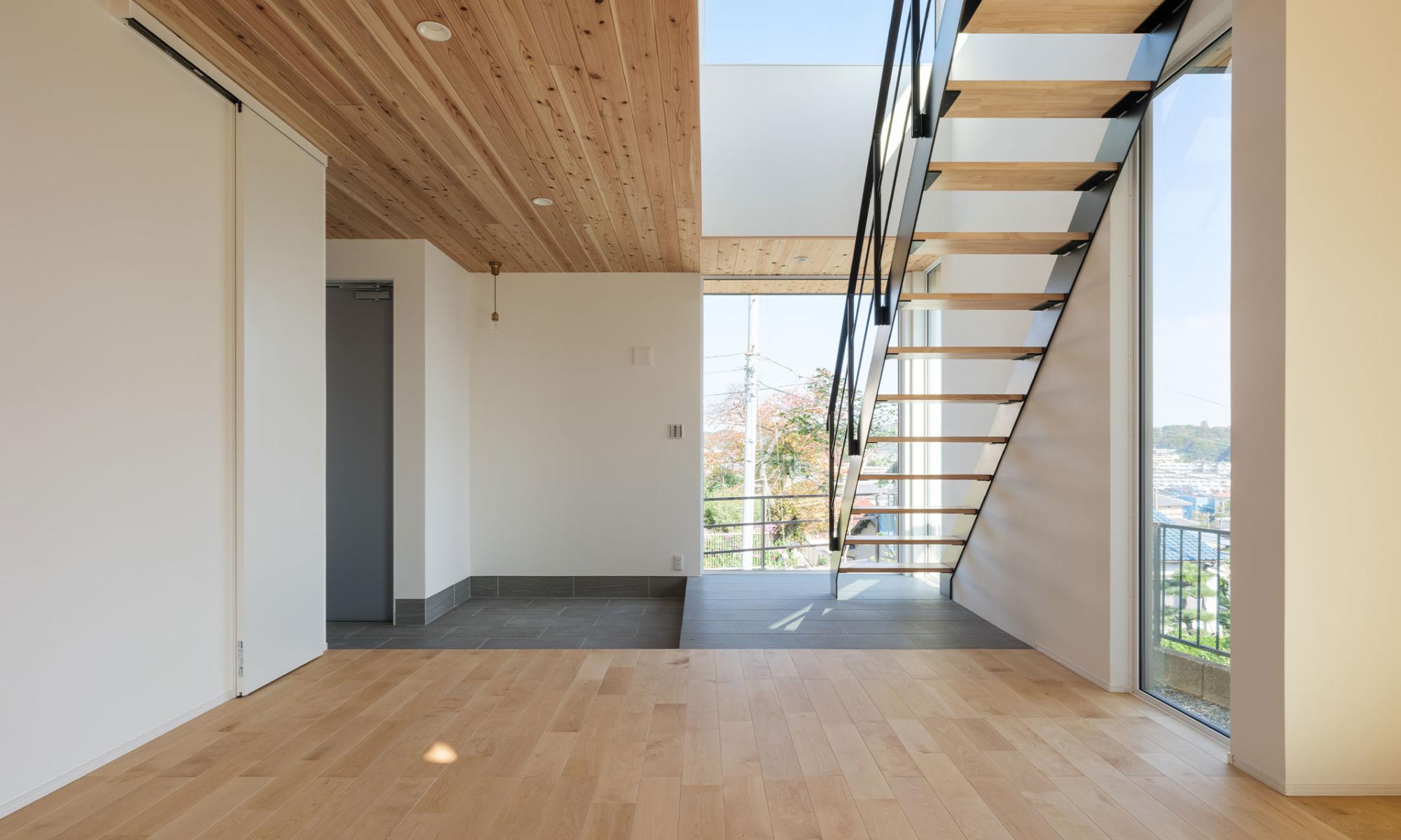外から見上げた際に印象的な軒の板張りと、どこからでも豊かな景色が一望でき花火を眺めることもできる大きな窓がのびやかな印象を与え、この高台に建つ家の魅力を最大限に引き出しています。