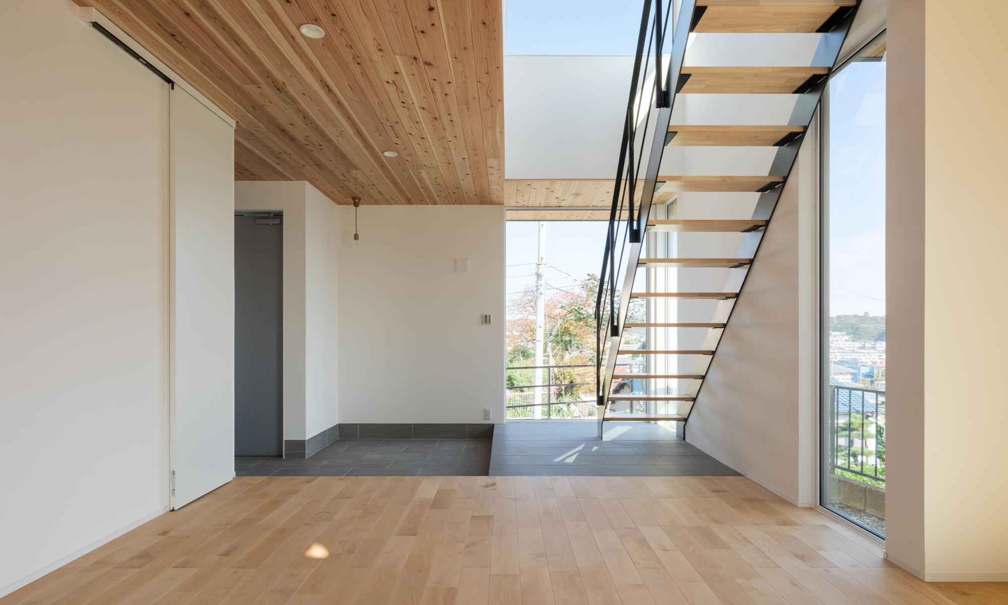 大きな土間エントランスにはゆったりとした階段を設け、視線の先には空を切り取る明るい吹き抜け空間が広がります。空と光の変化が、上下階の移動を風景とのつながりを感じる体験へと変えます。