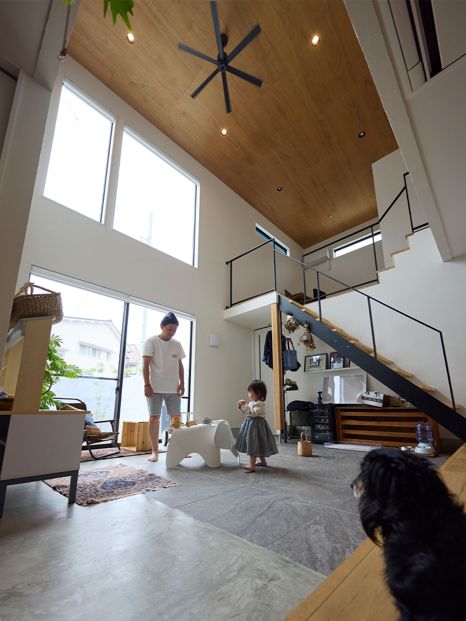 玄関から入ってくると圧巻の開放感をもった土間が出迎えてくれる。住み慣れても、飽きることなく心を開放してくれるとても素敵な空間。お子さまとワンちゃんが気持ちよさそうに、楽しく過ごす光景を見ていると、自然と笑顔になってきます。