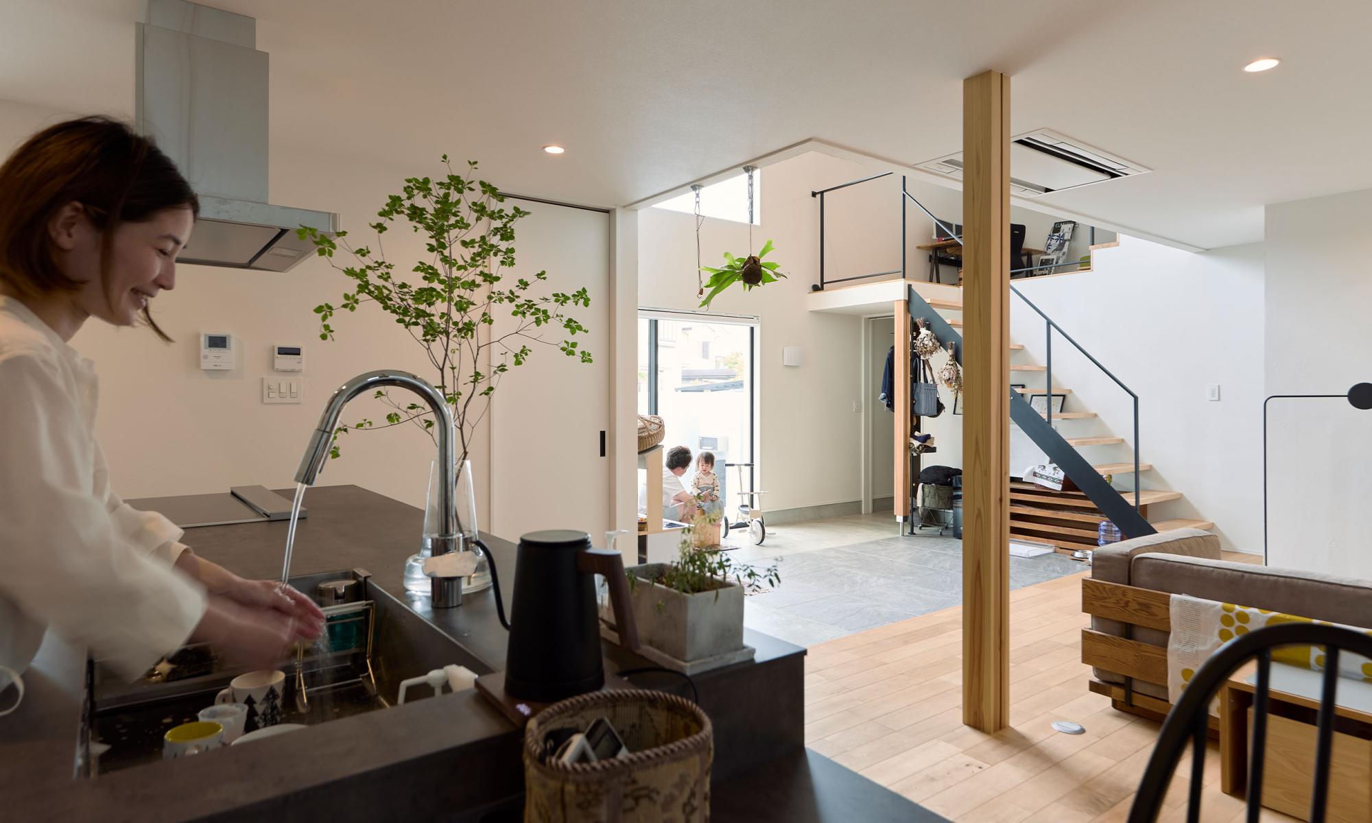 土間・リビング、そして玄関から帰ってくる家族、2階から降りてくる家族が見渡せる位置にキッチンを。遮るものがないから、コミュニケーションもとりやすい心地よいレイアウトです。