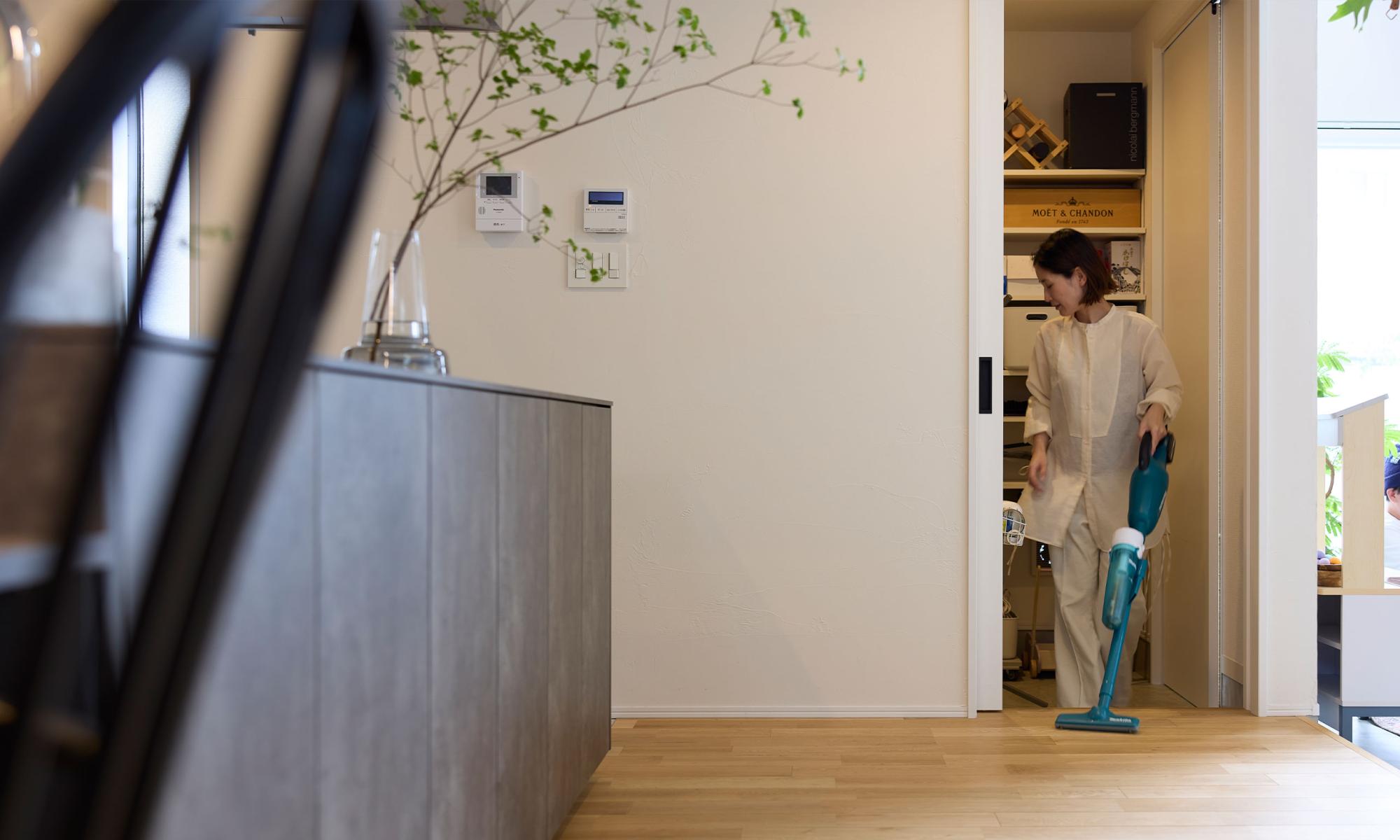 掃除道具やストック品をしまっておける約2帖のウォークイン収納。スティック型掃除機も充電したまま収納できるから、お掃除したいときは、さっとはじめられる。