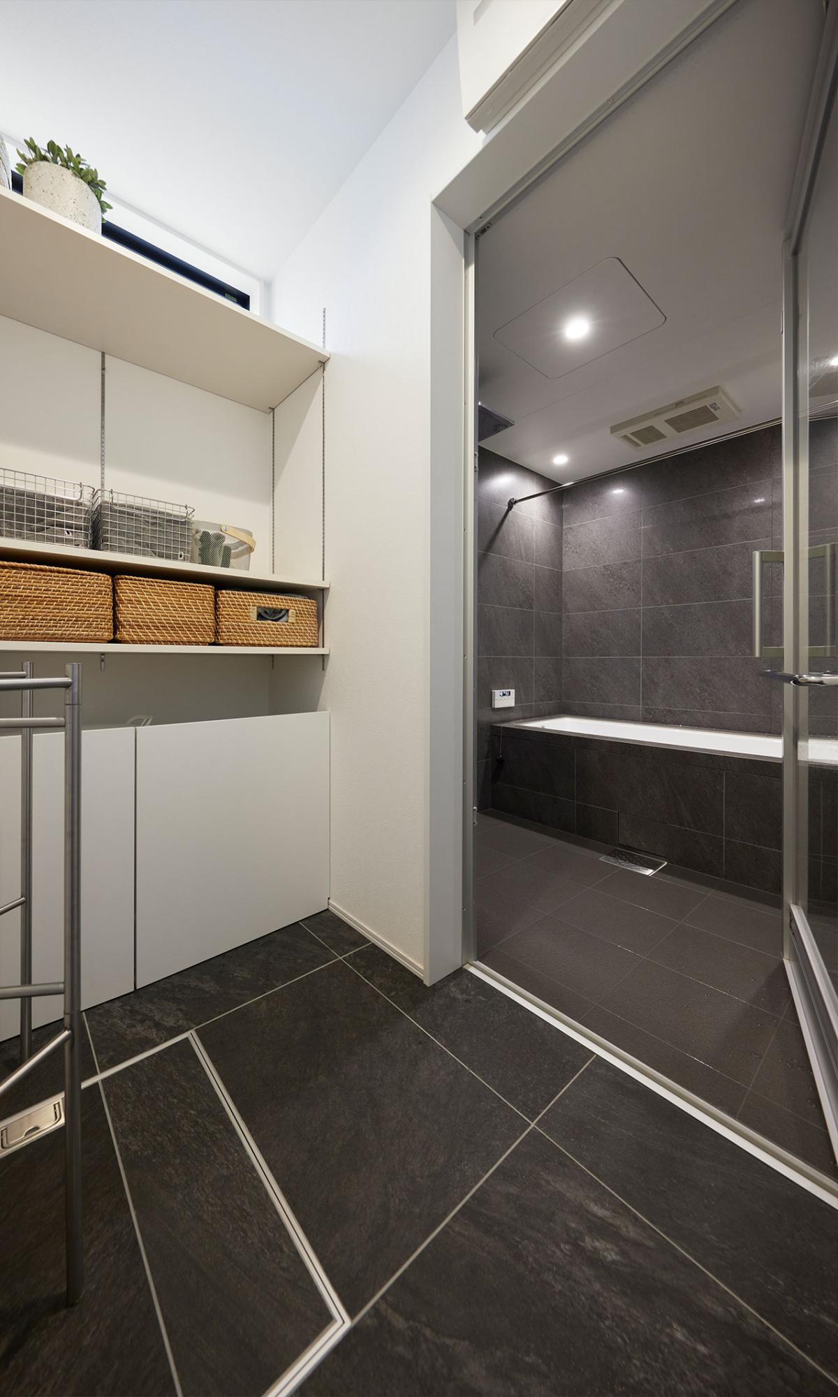 建築・住宅関連のお仕事をされるご夫婦ならではの細部へのこだわり。バスルームには石彫がかっこいい、こだわりの製品を。脱衣コーナーも可動棚に脱いだものを隠して放り込める、徹底した「映える暮らし」のデザイン。