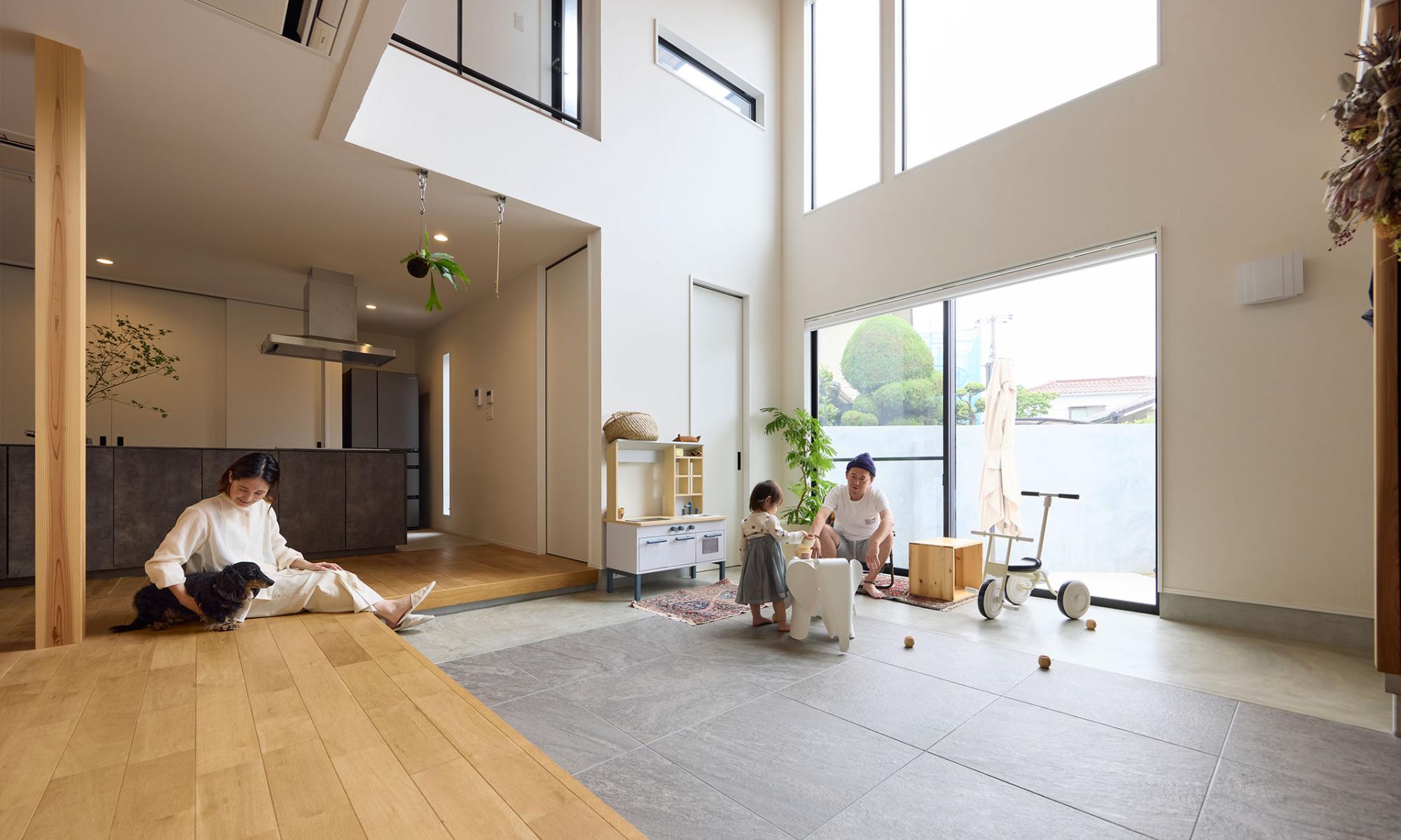 おうちの中なのに「空が高い」ような気持ちになる。フローリングとの段差は腰を掛けるのにちょうどよく、中にいるのに外で遊んでいるような、だけど家族だけでゆったりと寛ぎの気持ちを保つことができる。
