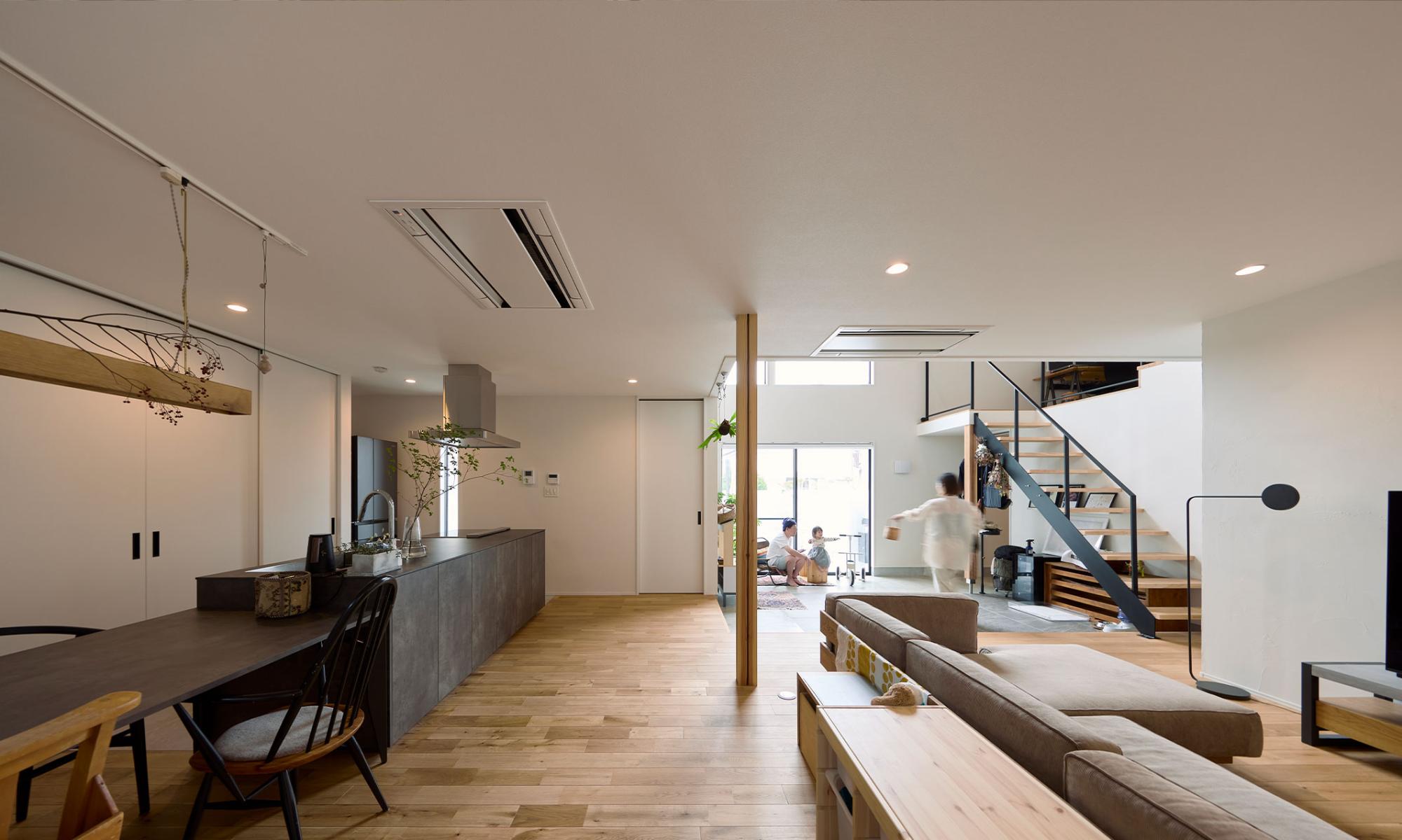 土間〜キッチンダイニング〜リビングが三角形につながる大空間。フローリングと真っ白な天井の「面」の広さが、より一層、空間のまとまりと広がりを演出しています。エアコンも埋め込み型にすることで、すっきりとした快適な空間に仕上げました。