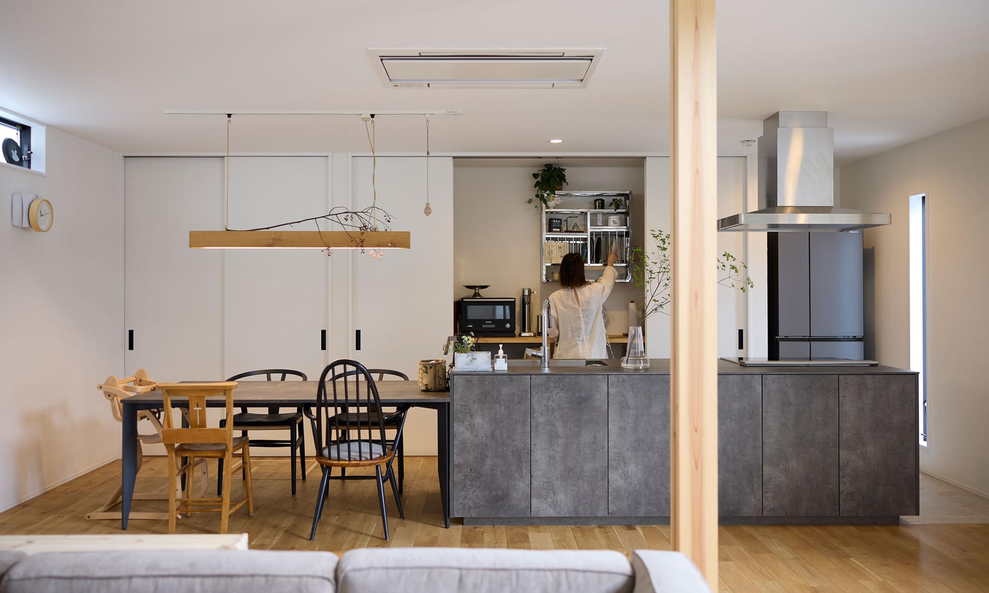 キッチン収納はすべて扉で隠せる仕様に。すっきりとして、のびやかな空間を邪魔しないように考えられた設計です。「後輩や友人がしょっちゅう遊びに来る」家だから、いつでも片付くことがうれしい。