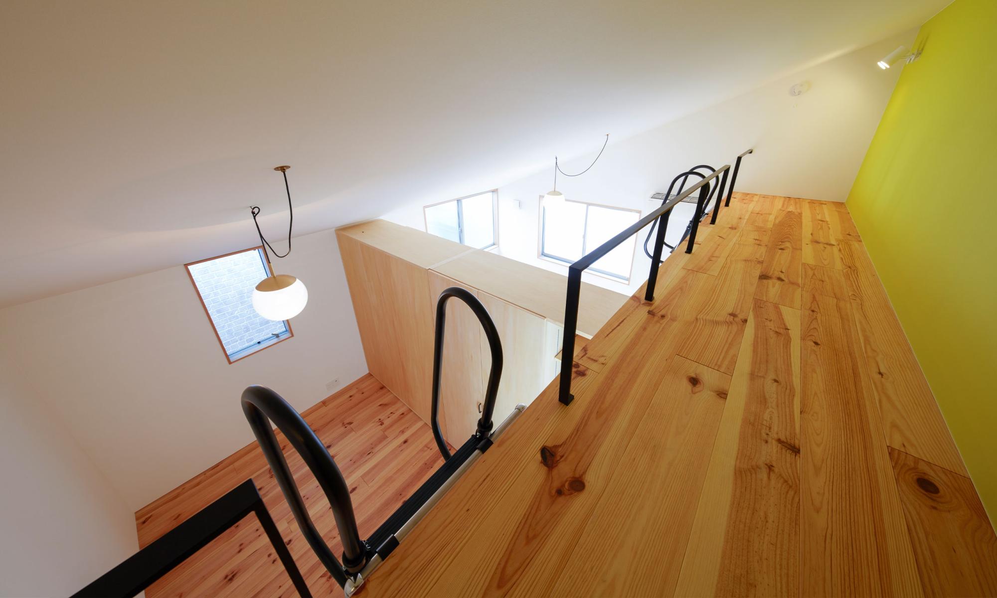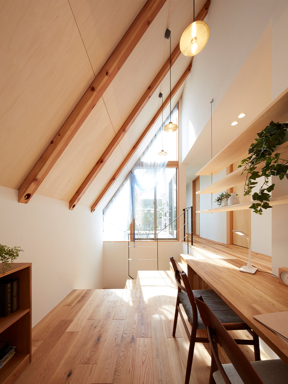 中2階のフリースペースは、1階はキッチンへ2階は各個人の寝室につながっていきます。家の中で人が動けば、この場所に動線が集まってきます。そういった中間地点の役割をもった場所にこれだけの明るさとゆとりがあれば、勉強をしている子どもに声をかけてあげたり、仕事をしているお父さんの横で子どもが勉強をはじめたり、お互いの行動で刺激し合う暮らしが生まれると考えました。