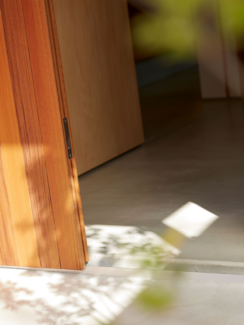 玄関ドアはいわゆる既製品ではなく、オリジナルのサイズ、オリジナルの考え方で備え付けました。ボーダーレスを玄関から体現できるよう、引き戸のレールは上部だけの吊り下げ型。品のある飲食店に入っていく様な、特別感を演出しています。